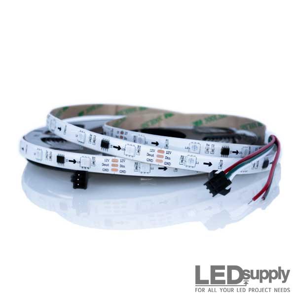 | LED Type: 5050 SMD RGB, IC-addressable | LED Density: 30 LEDs per meter (10 pixels per meter) |